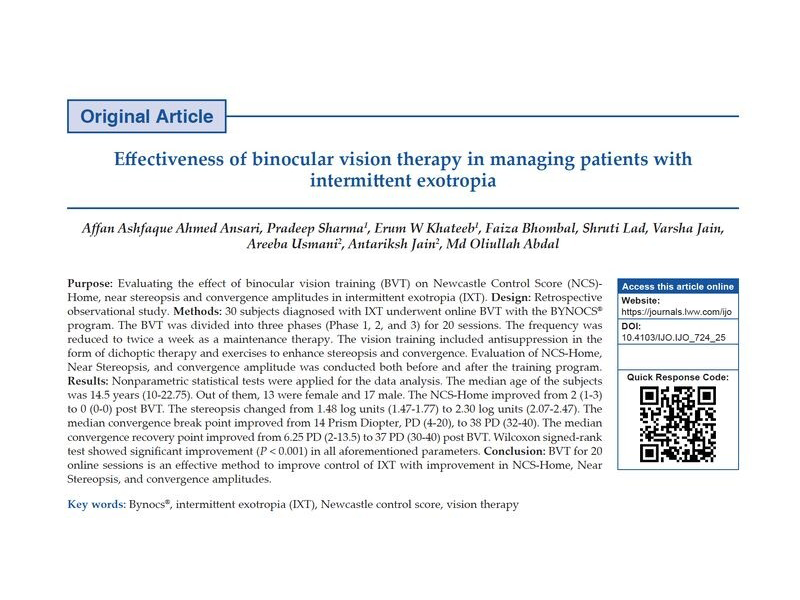 We proudly announced the publication of breakthrough research demonstrating the effectiveness of binocular vision therapy using the Bynocs #SquintEase program for intermittent exotropia management. This work represents a major step forward in the field of binocular vision science.